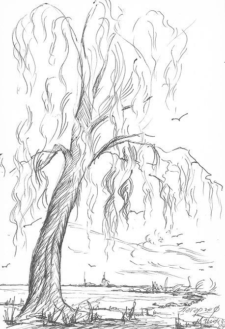Кирха под берёзами на развалинах храма Святовита. Рисунок автора. Конечно нет там никакого коловорота - я его разместил чтобы придать изначальный смысл данному месту. Июль, 2019г.("Путешествие на остров Буян") |