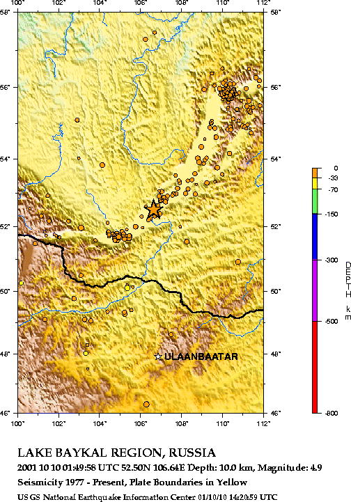 Землетрясение на Байкале 10 Октября 2001 г. в 1:49:58 по UTC в районе с координатами 52.50 с.ш. и 106.64 в.д. произошло землетрясение средней силы. Очаг располагался на глубине 10 км. Магнитуда составила по данным USGS 4.9 по первым сообщениям российских средств информации 7,3! Подземные толчки силой 7,3 балла зарегистрированы сегодня в 05.50 мск на побережье Байкала в 45 км севернее поселка Кабанск (Республика Бурятия). Как сообщили в республиканском комитете по чрезвычайным ситуациям, по предварительным сведениям, разрушений и жертв нет. Однако пока нет информации о последствиях толчков из двух населенных пунктов Бурятии - сел Посольск и Шигаево, расположенных неподалеку от эпицентра землетрясения. С селами нет связи. Подземные толчки силой до 3 баллов ощущались и в столице Бурятии. Комитет по чрезвычайным ситуациям Бурятии продолжает сбор сведений о последствиях стихии Район расположен в 95 км от г. Улан Уде и поэтому в городе нет разрушений.