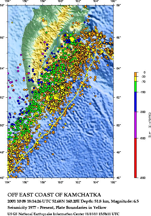 Землетрясение близ берегов Камчатки с магнитудой 6.4 8 Октября (9 октября по местному времени) в 18:14:26 по UTC произошло сильное землетрясение близ берегов Камчатки в районе с координатами 52.733 с.ш. и 160.199 в.д. Магнитуда 6.4, глубина очага 24 км. Кинематика разрыва взбросо-сдвиг. Район очень активный и является северным продолжением Курильской островной дуги, сейсмическая активность связанас быстрым поддвигом Тихоокеанской океанической литосферной плиты под активную окраину Азии (Охотоморская плита).