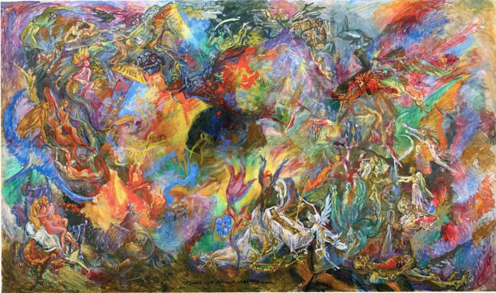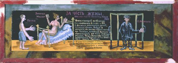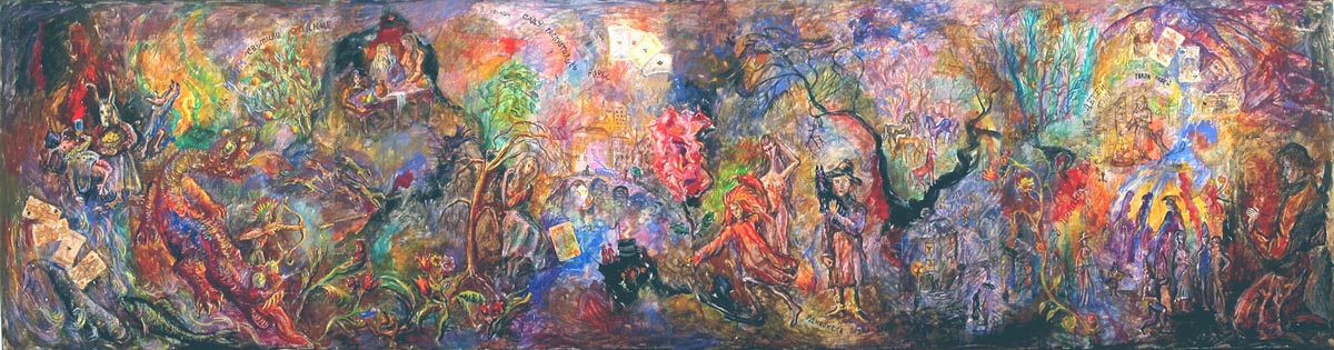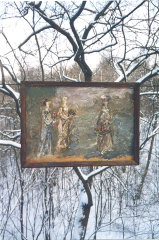 Но денег я не получил. Рассказал об этой ситуации Сергею Миллеру, и мы решили, так как оплачена половина работы, одну композицию забрать. Кинули альпинистскую вёревку через плечо, ранним, погожим субботним утром отправились на вокзал, доехали на электричке до нужной станции, долго шли просёлочной дорогой. Подойдя к даче Вирикова, мы увидели на веранде его женщин, затем, побледнев, появился он и безропотно отдал нам одну роспись. Веревка пригодилась для крепления листов оргалита и последующей переноски. Вот такая смешная история, связанная с этой картиной.
