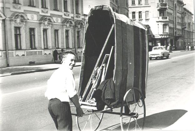 Яркие воспоминания в памяти оставили наши похождения с Сергеем Миллером по арбатским задворкам и выселенным, обреченным на слом домам. Летом 1974 года во дворе на улице Фрунзе я увидел тележку с большими металлическими колесами и укатил ее к себе в дворницкую. Сварщик в театре Оперетты сварил по моему чертежу каркас из толстой проволоки, его я обтянул плотной тканью, покрасил её полосами разного цвета, а колеса красной краской. Получилась телега-арба, с ярким цветным азиатским тентом и громыхающими при езде по асфальту колесами. В эту телегу-арбу я погрузил свои холсты, живопись темперой на оргалите, красный патефон, пластинки, веревку. Утром 25 августа, предварительно пригласив своих друзей и знакомых на предстоящую выставку, я покатил эту громыхавшую колесницу по Комсомольскому проспекту в сторону центра Москвы.