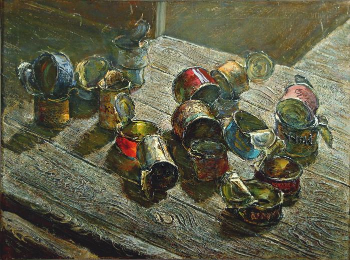 Прошли годы, я несколько раз встречался с Рогинским в Москве. Помогал ему с монтажом его выставок, натягивал на подрамники холсты. Он приходил к нам с Надей в гости. Мне хотелось показать ему свои картины раннего периода: "Консервные банки", "Орудия труда", "Камни", "Бездомные вещи", но как-то не получалось. И вот пришла весть - он тяжело заболел. Когда я позвонил в Париж, Нана сказала, что он лежит без сознания, рак лимфатических узлов, возможно, потребуется операция. При втором звонке Рогинский подошёл к телефону. Я был поддатый, спросил его, почему он не нашёл время посмотреть мою живопись... и заплакал. "Промашку дал" - ответил Миша. Через день он умер.