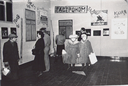 Композиция "В ночном саду распустились розы" вызвала вопросы, так как был коллаж из игральных карт. Живо проходило обсуждение картины "Осенний вихрь". Два подвыпивших мужика, недоуменно уставившись на работу с надписью "Вино", хотели, было, опрокинуть ее, но обошлось. По окончании моей уличной выставки, погрузив в телегу картины, я с друзьями повез ее по Гоголевскому бульвару в сторону Арбатской площади. В каморке дворника, новом жилье Сергея Патрушева, в Нижнем Кисловском переулке с компанией друзей я устроил скромный выпивон.