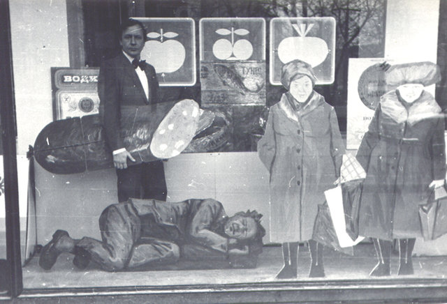 Катилась шляпа по Арбату колесом, поддаваемая ветром, тёмно-зелёная, Догнал её, примерил, она была почти новая. С тех пор я подметал Арбат в длинной синей рабочей блузе и зелёной шляпе. Территория моего участка была от магазина "Овощи-фрукты" до магазина "Школьник", недалеко от ресторана "Прага". Летним утром, сметая кучу окурков, увидел сидящих на приступке окна магазина "Овощи-фрукты" двух бомжей - бабу с опухшими, в язвах, ногами и мужика. Вид они имели драматический, одеты были в живописные лохмотья: "как на офортах Рембрандта", - промелькнуло в голове. В советское время бездомные бродяги встречались редко, их быстро отлавливали. Задрав, подтянув к коленям тряпьё, с одутловатым сизым лицом, баба грела ноги, обутые в засаленные обноски "прощай молодость", на тёплом утреннем солнце. Работая метлой, я передвигал кучу окурков мимо этой пары. Бомжиха попросила выбрать ей бычок с тротуара. Я подал ей чинарик, зажёг спичку, она закурила. С тех пор, несколько дней подряд, у меня с бомжами проходила эта церемония, которая превратилась в некий ритуал - без слов, одними глазами мне давали понять, где находится выбранный окурок. Я выступал в роли тротуарного бармена. Делал это, скорее из любви к искусству, к офортам Рембрандта, чем из христианского милосердия. Но возможно присутствовало и то и другое. Бомжам же, видимо, нравилось, что молодой мужчина в шляпе подыскивает им в куче мусора подходящий окурок, даёт прикурить, тешили своё, уязвлённоё мраком жизни, самолюбие. В это время я нарисовал темперой на оргалите работу, изобразив жанровую сцену с бомжами у магазина "Овощи-Фрукты".