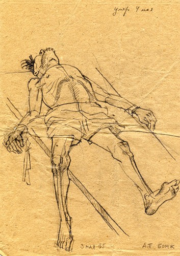 Здоровье у этих ребят было совсем подорвано "нарзаном" - некоторые голыми были привязаны простынями за руки и за ноги к кроватям, бредили, головы были запрокинуты. Другие в подавленном состоянии духа сидели на кроватях. Их рассказы, жизненные истории алкоголиков, запомнились своей комической нелепостью, абсурдностью. Лечащий врач скептически, с недовольством отнёсся к тому, что я стал рисовать и беседовать с больными: "Зачем это, какие цели?". Я пообещал, что эти рисунки в ближайшее время никто не увидит. Это было в начале мая 1995 года. С грустью наблюдал я, как за окном появлялись бледные весенние зелёные листья, а пациенты соседней палаты, один за другим, немного помучившись, отправлялись в мир иной, их тела в больничный морг...