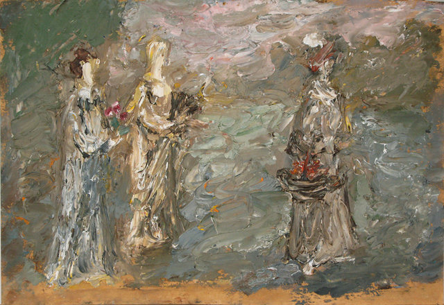 Теперь расскажу об одной необычной ветке на дереве моего творчества. Её молодой росток появился на стволе неожиданно, в 1985 году. За двадцать пять лет ветка превратилась в красивую крепкую ветвь, родившую сотню плодов-картин. Их стиль, манера исполнения, отличались от всего, что я писал раньше. Эти картины могли бы стать творческим венцом и наследием яркого, талантливого живописца. Было так - у меня наступил творческий кризис, я не понимал что делать дальше. Бесцельно размазывал пальцами масло на картоне (29х42см.), как бы сами собой, возникли три женские фигуры в платьях до пят. В руках одна фигура держала веер, другая - цветок, третья - корзинку.