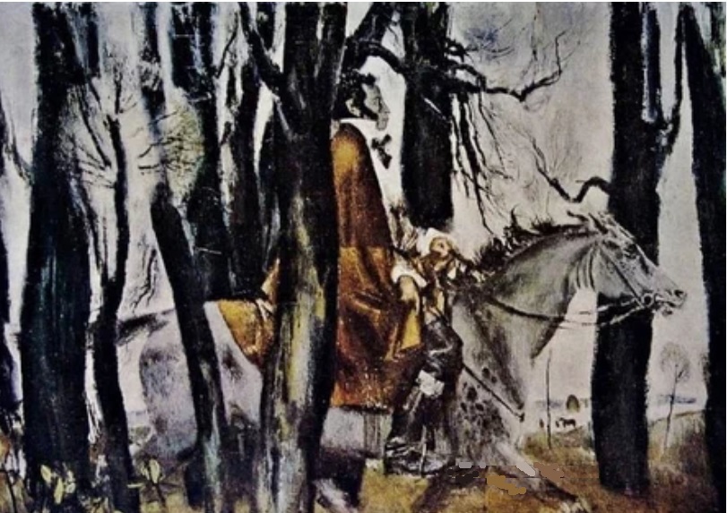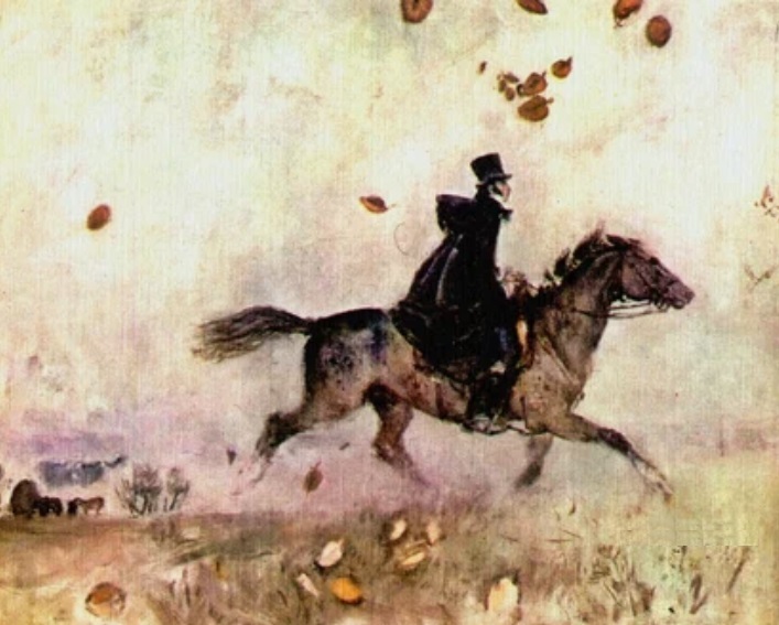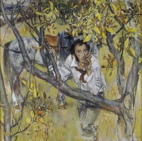 Моисеенко. Пушкин в Михайловском. 1974. Мы читаем стихи Пушкина, и, где есть кони, у нас ассоциация "с вольностью и свободой” (https://proza.ru/2008/10/31/16). Из-за чего? Из-за того, что Пушкин в стихах не по лесу ездит возле Михайловского: