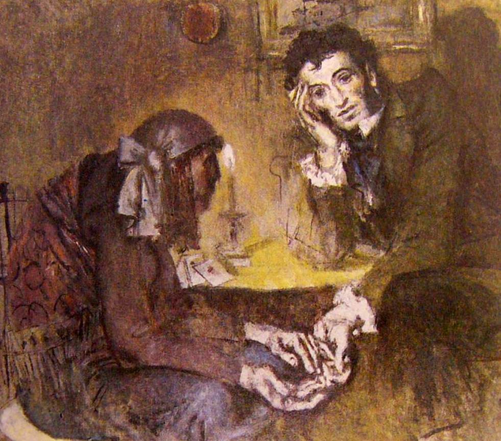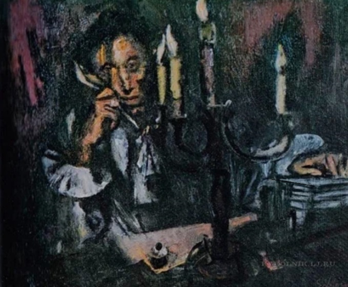 Моисеенко. Вечер (А. С. Пушкин). 1974. Советские люди, сами оптимисты из-за гарантированности государством и конституцией обеспечения их работой, и Пушкина понимали в соответствии с известным изречением Белинского: “Пушкин не дает судьбе победы над собою; он вырывает у ней хоть часть отнятой у него отрады”. Так совки не замечают, что Моисеенко им представил совсем другого Пушкина, каким его стали описывать после реставрации капитализма – что он в конце жизни искал смерти. Что он решил было хотя бы уйти из литературы в историческую науку. Ибо он 12 раз идеал сменил, из-за разочарования в каждом предыдущем. Устал. Жена сомнительно, что его любила. – Пессимизм. Эта содержательная подначка тому, что привычно для совка, провалила фронт сознания, и то впустило в “текст” признаки крайнего разочарования советскостью: страшное корёжение натуроподобия. – Откуда тень на левом от нас глазу Пушкина? – От пера? Но для этого надо чтоб свет падал не справа (глядя от нас), где нарисованы свечи, а слева. От негорящей свечи тень могла б падать. Но горят все 4 свечи. Крайняя правая свеча не из своей чашечки подсвечника торчит. Самая высокая свеча имеет не цвет воска. Следующая вещь.