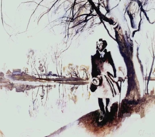 Моисеенко. Пушкин в Болдино. 1974. Что знали советские люди про Болдинскую осень? Что это был наиболее плодотворный период его творчества. А что мы видим на картине? – Что он не пишет, а шатается по берегу озера. Подножка совку. Спускающая целую свору экспрессионистских “фэ” времени создания вещи. Тут и немыслимые белые блики на сюртуке Пушкина, его тёмных штанах, полях чёрной шляпы, дереве, траве на переднем плане, и ужасная тень на правой пушкинской щеке. Далее.