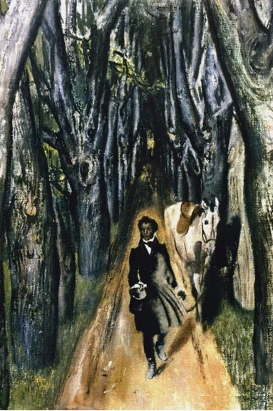 Моисеенко. Пушкин на аллее. 1980. Мне вспомнилась такая фраза из “Фиесты” Хемингуэя: “В газетном деле, этика которого требует, чтобы никто никогда не видел тебя за работой…”. А также своё студенчество. – Шиком было во время экзаменов из пяти, скажем, дней, получающихся для подготовки к следующему экзамену после предыдущего, четыре прогулять, в пятый засесть до утра, когда надо уже идти на экзамен, прийти, сдать его на хорошую отметку и похвастать, дескать, я только вчера сел готовиться и кончил утром. Все выкатывали большие глаза и спрашивали: “И ты смог совсем не спать?” А я хладнокровно отвечал: “Да”. И все восхищённо молчали. Про Пушкина народ, не знающий его творчества, прекрасно знает, что он был рубаха-парень и большой шалопай. Но и знают, думаю, как выглядели его черновики. Ужас. Прочесть ничего нельзя. То есть он сочинял с пером в руке и на бумаге, а не на ходу или при езде. – Накладка в том, что художник не изображает его пишущим. – Когда же тот пишет? – Что не замечается. И что даёт возможность подсознательному идеалу настоящего социализма в гневе прорваться в “текст” вещи, творимой при ненавистном лжесоциализме, - прорваться экспрессионистскими корявостями натуроподобия. Этими невероятными бликами света, да ещё и со стороны, противоположной солнцу (смотрите, куда тень падает – назад и вправо), на сюртуке и ногах. Этой тенью от лошади, падающей на… промежуток между стволами. Этим отсутствием теней от всего остального, кроме Пушкина и коня. Странно! Все смотрят. Никто не замечает. Хвалят. И публика и власть… Все переродились от нацеленности на то, что ниже пояса, на Потребление. Следующее.