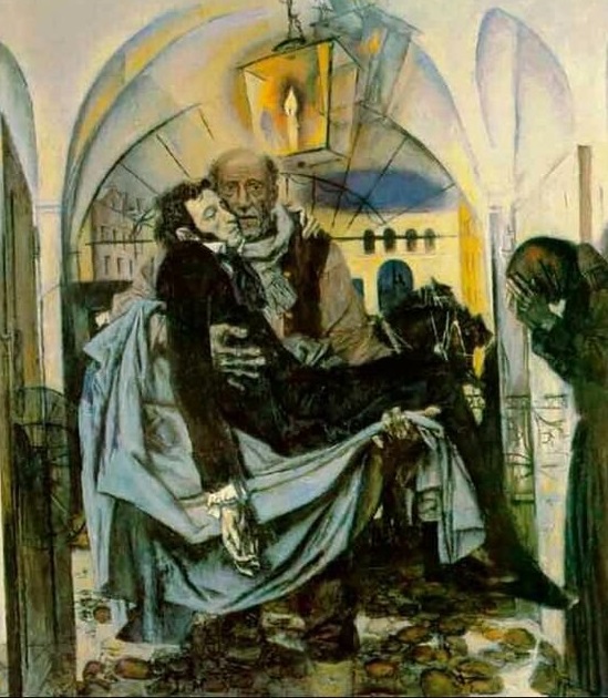 Моисеенко. Памяти поэта. 1984-1985. Имеется в виду, что несёт смертельно раненного (и потому бледного) Пушкина его старый слуга Никита Козлов, про которого мало кто знает и который уж точно ничего в поэзии не смыслил, а просто любил своего барина, как человек человека. Но под ударом экстремиста-экспрессиониста Моисеенко находится именно гуманизм. Которому привержен был и совок, как к буржуазному (пусть и лживо-пропагандистскому по сути) явлению. Да, отчаяние от ухода перспективы построения коммунизма в какое-то не известно, достижимое ли, сверхбудущее, превратило экспрессионизм в ингуманизм. Что и выражено в этой страшной правой ручище Никиты Козлова. Да, Моисеенко стал совконенавистником. Ибо и все советские люди через 150 лет после смерти Пушкина проявляли в общем какую-то нелитературную, а просто человеческую любовь к Пушкину, будто это близкий сосед или родственник. От потери это, если положа руку на сердце, коммунистической перспективы – к самосовершенствованию. Гуманизм и вообще то, что у или ниже пояса, - роднее оказалось. Следующее.