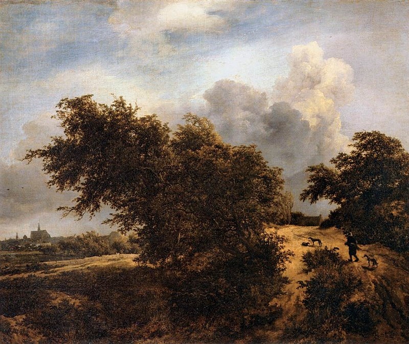 Рейсдаль. Кусты. 1653. "…висящий в двух шагах от нее маленький “Куст” Рейсдаля казался мне желтоватым, ватным, несколько безличным. И я готов был иногда отдать предпочтение Хоббеме, тем самым впав в заблуждение, которое, конечно, не могло бы сохраниться надолго, но все же непростительно, будь оно даже мгновенным. Рейсдаль никогда не умел вставить в картину хоть одну человеческую фигуру [смотрите, какие коротенькие ножки у человечка, идущего справа]… Нет у Рейсдаля и золотистой атмосферы Кейпа, его ловко найденной манеры купать в свете и золоте корабли, города, лошадей и всадников, — все то, что он рисует со знакомым нам блеском, когда ему все превосходно удается. Хотя Рейсдаль и не уступает никому в мастерстве моделировки [придания иллюзии трёхмерности тенями и цветом], когда пишет растения и воздушные пространства, он все же не сталкивается с теми исключительными трудностями, как Терборх и Метсю, когда они моделируют человеческое тело. Как ни испытана проницательность его глаза, все же она не так велика в силу самих сюжетов, с которыми он имеет дело. Как ни ценны его пенящаяся вода, бегущее облако, обросшее кустами дерево, волнуемое ветром, низвергающийся между скалами водопад, — все это, если учесть сложность целей, обилие и тонкость проблем, уступает в точности решений <…> Рейсдаль не выказывает никакой живости ума. И в этом отношении рядом с остроумными мастерами Голландии он кажется несколько мрачным. Если разобраться в привычных приемах Рейсдаля, он представится вам простым, серьезным, сильным, очень спокойным и значительным, почти всегда ровным, причем все эти достоинства настолько жизненны, что перестают вас захватывать. Перед этой маской, которая никогда не улыбается, перед этими почти всегда равноценными картинами чувствуешь себя иногда смущенным их красотой, но редко бываешь поражен. Наконец, колорит у него сильный и гармоничный, но однообразный и не очень богатый: он меняется лишь от зеленого к коричневому; асфальтовая подготовка служит основой. В нем мало блеска, он не всегда приятен и в своих основных элементах не особенно изыскан. Утонченный художник домашних сцен легко мог бы упрекнуть Рейсдаля в скупости средств и счел бы его палитру подчас слишком упрощенной. Но при всем этом и вопреки всему Рейсдаль — единственный в своем роде художник…” (Фромантен. Старые мастера). И в другом месте: "У нас же [французов], если сюжет в картине отсутствует, от нее требуется, по крайней мере, живое, правдивое чувство и ясно ощутимое волнение художника. Пейзаж, не выражающий настроения самого художника, — произведение не удавшееся. Мы не умеем, подобно Рейсдалю, создавать шедевры, изображая пенящуюся и мчащуюся между темными скалами воду. Животное на пастбище без выраженной идеи, “без понятия” — как говорят крестьяне об инстинкте животных, — недостойно [мол] кисти художника” (Там же). Так это в Голландии, гордой, грубо говоря, малозначительностью буржуазной (да и страна маленькая), всё же сумевшей себя отстоять рядом с великими странами, у которых имперское величие. Вообще разнообразие: католики и гугеноты, дворяне, клирики, третье сословие. С мирящим их распри королём. С соответствующим искусством, у которого есть "сюжет”. И имеющим такую характеристику: "Живописец всё определённее начинает воспринимать и передавать природу под 