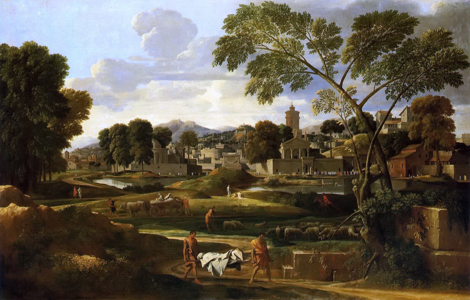 Пуссен. Пейзаж с похоронами Фокиона. 1648. Здесь ещё и сюжетная разноголосица. Фокиона убила толпа. Поэтому хоронят его только два человека, несущие носилки с трупом. Другие занимаются своими делами: кто пасёт овец, кто везёт какую-то поклажу, кто валяется на травке, кто прогуливается.