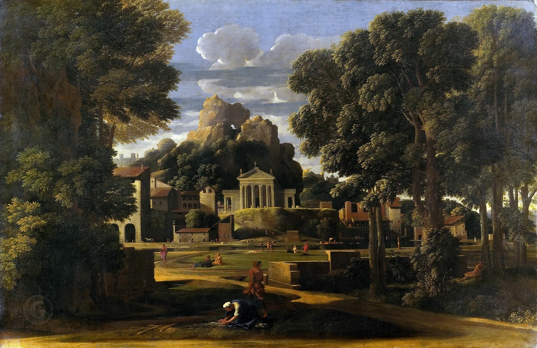 Пуссен. Итальянский пейзаж с отдыхающими путниками. И наоборот: когда на небе драма, в пруду зеркально гладкая вода.