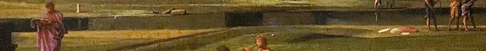 Пуссен. Пейзаж с вдовой Фокиона, собирающей его пепел. 1648. Сюжетно и тут вдова одна (подруга сторожит, чтоб она ничьего внимания не привлекла), а всем остальным людям (их почти 3 десятка по одному-двум рассеяны) – до лампочки. Но без глади вод