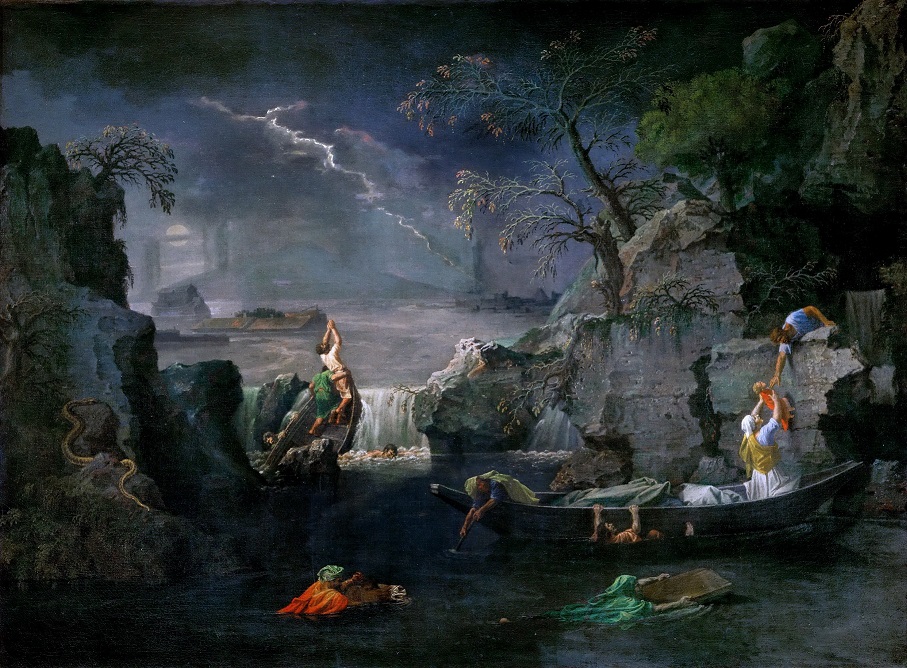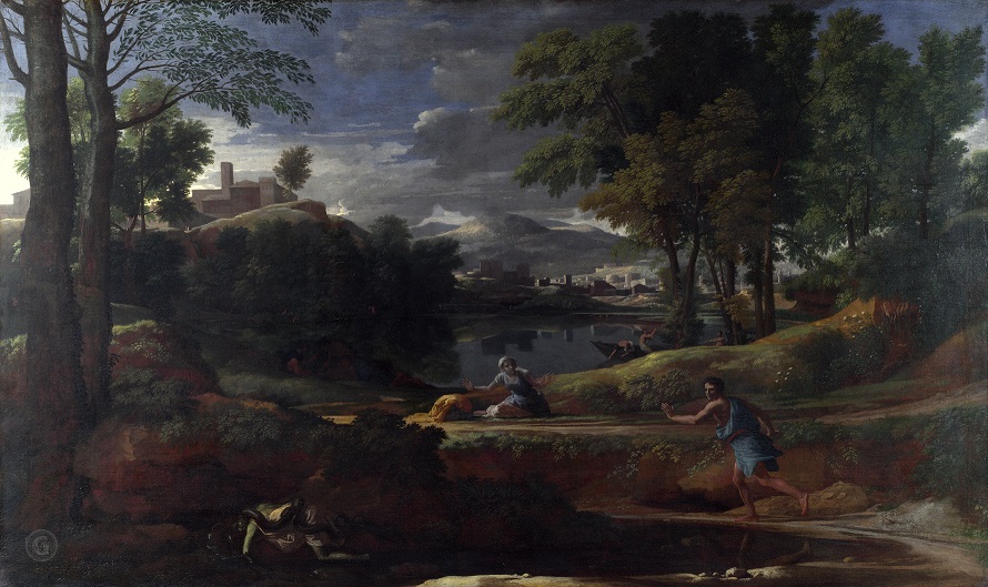 Пуссен. Пейзаж с человеком, убитым змеей. Ок1648. То же. Даже небольшой водопад и моление богам о спасении в преодолении этого водопада (все преодолевающие оказываются в воде и более-менее драматически из неё выбираются) не мешают впечатлению спокойствия вод.