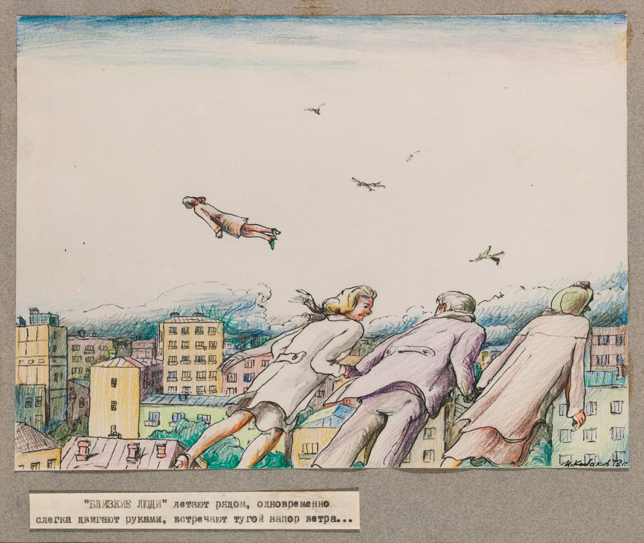 Пустое содержание хвалёного коллективизма советских людей, по идее – с высокими помыслами (вон, летают), а на деле – их общие ощущения: всего лишь ветер. Низшее из ощущений. Совки. А как не образно, а катарсически? Двумя вариантами. Один – доведением зрителя скукой Правил до предвзрыва, предполагающего взрыв такой силы, что он вышвырнет душу восприемника в метафизическое иномирие. Другой доведение чувствительных до стремления покинуть Этот мир за его неопределённость – в иномирие же. Для первого варианта приобщение к искусству происходит в форме перформанса. Надо исполнять ряд правил приобщения. Во-первых, это должны быть специально приглашённые люди. Все объекты оформлены в альбом. Альбомом распоряжается сам Кабаков. Перелистывает. Возможно, читает написанное. Даёт смотреть. Задаёт мерный темп всего процесса. – Чтоб довести вас до предзрыва от давления Правил на Этом свете, отдалённо перекликающихся с тоталитаризмом в СССР. А строго говоря – всюду. Для второго варианта организовывается Неизвестность, что происходит: смотрение или чтение. Приглашённых Кабаков знает, что они не переносят принципиальную на Этом свете Неизвестность. – Вот они и взволновываются и стремятся в иномирие. Приобщение к Нему, принципиально недостижимому даёт чувство удовлетворения в результате. И, что нарисовано, не имеет значения. Тихий ужас. Если ценность живописи в исполнении и вымысле, то вымысел лишается смысла. Исполнение – вы сами видели – нарочито корявое. 29 декабря 2023 г.