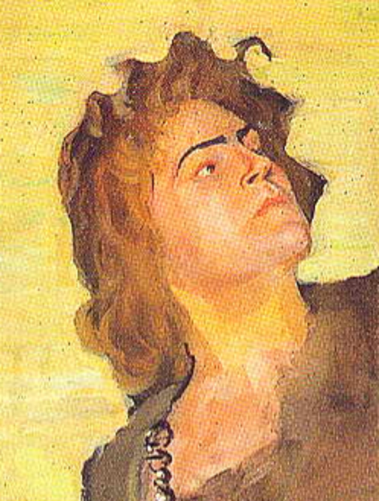 Кустодиев. Портрет Ивана Ершова в роли Зигфрида. 1908. 257×204 см. Я думаю, что иллюстрируется финал из оперы Вагнера “Зигфрид”, второй в тетралогии “Кольцо нибелунга” – пока-победа Зигфрида: “Огонь, защищающий спящую Брунгильду [так наказанную, богом Вотаном за мнение, что любовь превыше инцеста], расступается перед Зигфридом, он поцелуем пробуждает валькирию" (https://soundtimes.ru/opera/spektakli/r-vagner-koltso-nibelunga). Роль огня у Кустодиева исполняют расступившиеся скалы. Все в тетралогии умирают. Для Вагнера отвратительно, что так устроен Этот мир (со смертью) и кончает он оптимизмом по-ницшеански: кольцо возвращается к прежним владельцам, дочерям Рейна, словно достигнута Неизменность и время остановились – образ метафизического иномирия, подсознательный идеал Вагнера. Я б не назвал “преувеличенной мимикой в изображении некоей запредельной эмоции” торжественно-спокойное выражение лица у Зигфрида, хоть эмоция, да, запредельная (он победил великана-дракона и завладел кольцом-для-властелина мира и Брунгильда – его!). Я б наоборот, сказал: что парадоксально мимика противоречит огромности эмоции. Зигфрид таки герой, раз так владеет собой. Это таки сверхчеловек, как по-бытовому понимают обычные люди ницщеанство. Другое дело, что Кустодиев здесь не поднялся на уровень неприкладного искусства, остался на уровне прикладного, приложенного к усилению знаемой, в общем-то, эмоции сверхчеловека в момент победы. (Ну способен же обычный человек представить себе сверхчеловека?) Я б не отнёс, как Кира Долинина, эту картину в “явные неудачи”. Просто к 1908 году Кустодиев ещё не нашёл за период "долгих и порой мучительных поисков… все же свой собственный путь в искусстве [барокко (см. тут), что, между прочим, не относится к “спокойной миросозерцательной позиции” по Долининой]. В этот период он сблизился с вновь созданным в 1910 году обществом “Мир искусства”" (https://imwerden.de/pdf/kustodiev_pisma_statji_zametki_besedy_vospominaniya_o_khudozhnike_1967__ocr.pdf). Кира Долинина, думаю, к Кустодиеву чуть предвзята – за то, что он слыл (и зря, по-моему) пробольшевиком. Но она права в том смысле, что эта картина – не шедевр. 2 января 2024 г